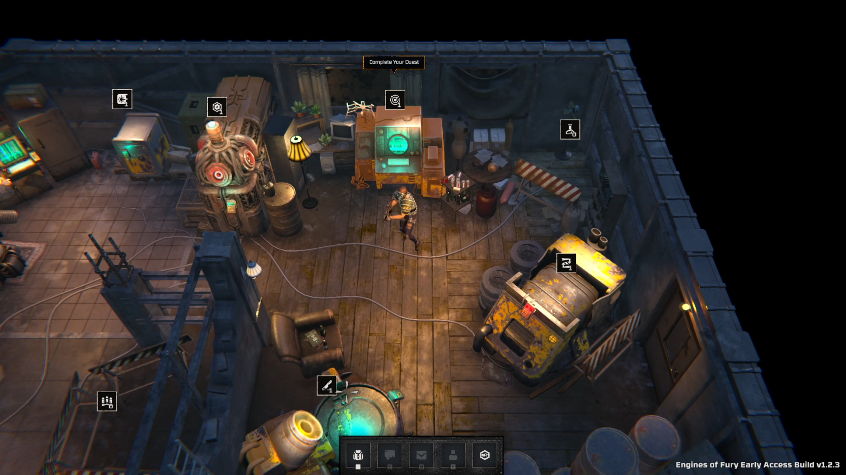 Your base of operations is where you make preparations to explore the outside world. There are machines in your hideout to help your progress in the game.