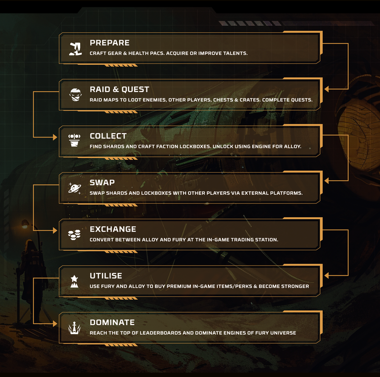 - Trading Station: The Web 3 integration is mostly from this machine. Trade items using the in-game currency ALLOY or the onchain currency FURY