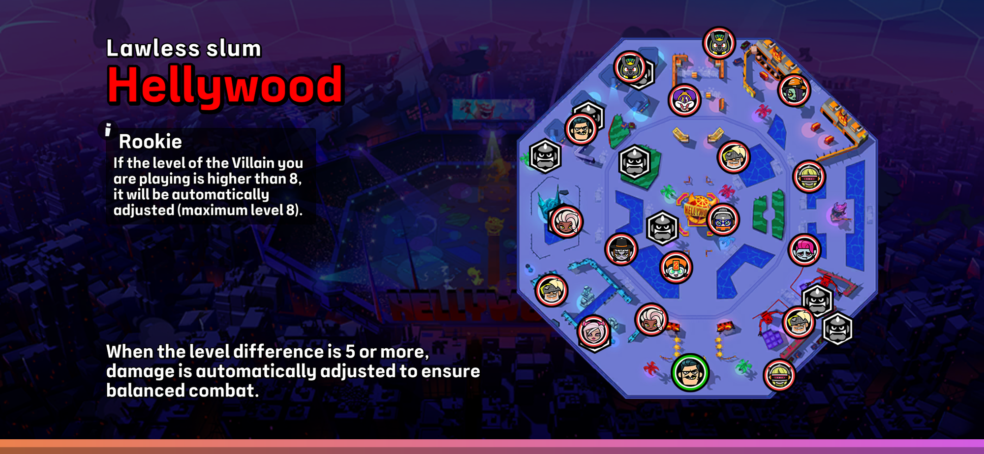 Hellywood, Lawless Slum. It's map is hexagonal shaped with the focus as if the final duel will be at the center of the map.