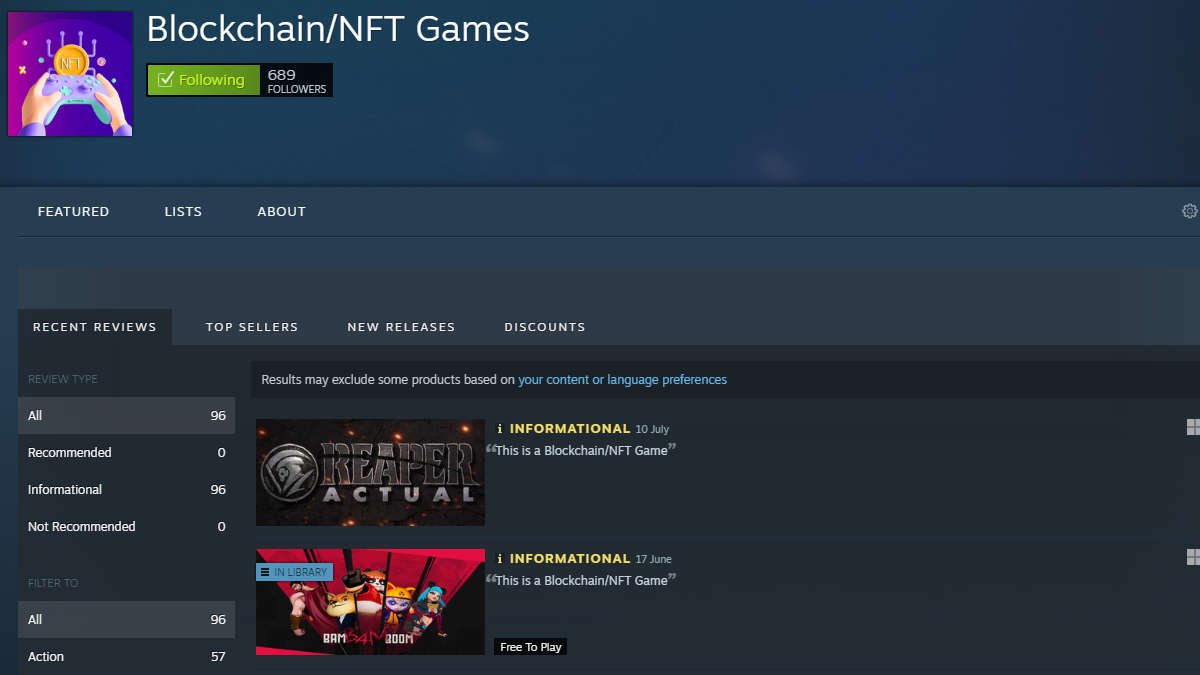 - Blockchain/NFT Games Steam Curator has a simple tagging of all games using blockchain on Steam. There is no review to provide more details. But this is already helpful as it is, as Steam does not have a 'blockchain' tag in the Steam store yet.